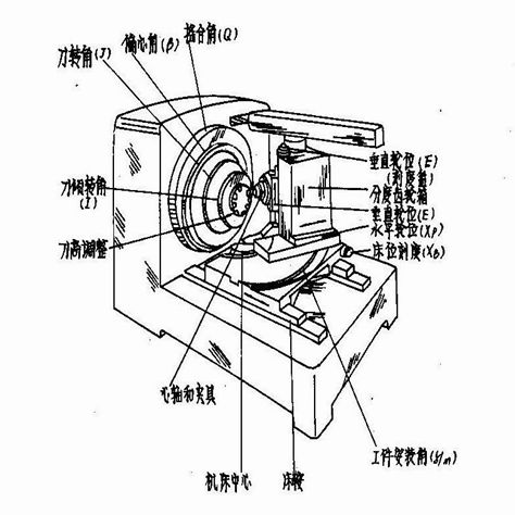 在生產實際中,通常采用兩種方法加工主從動錐齒輪傳動副,即全展成法(滾切法)和半展成法(成形法)。其不同之處在于,前一種方法應用展成法加工大輪,而后一種方法應用成形法加工大輪。半展成法一般只應用于傳動比較大的錐齒輪副的加工。而對于相嚙合的小輪,則采用展成法加工。根據所應用的銑齒機床的結構和傳動形式,小輪的加工方法有普通展成法,(既無刀傾機構調整也無滾切修正機構調整)、滾切修正展成法、刀傾展成法等。圖中表示了這些加工方法的切齒調整各部位。圖中分別表示床位、搖臺角、偏心角、刀傾轉角、刀傾角、水平輪位、垂直輪位、機床根錐角調整等。